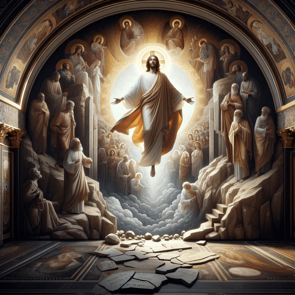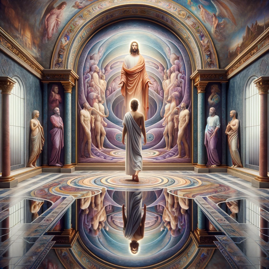 (cover image 1) prompt1: 3D rendering of the Anastasis Fresco, reimagined as a mirror to represent the ‘Christ within all that IS’.