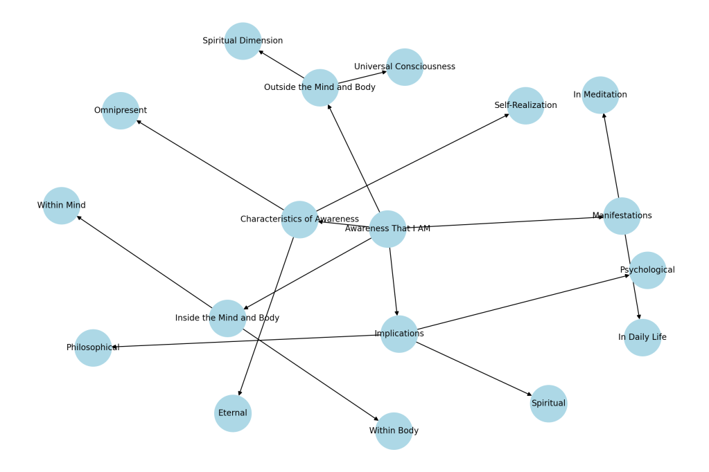 This mind map serves as a visual representation of the concept, showing how ‘Awareness That I AM’ can be perceived as an eternal presence both within and external to the mind and body, and its implications in various aspects of life and thought.