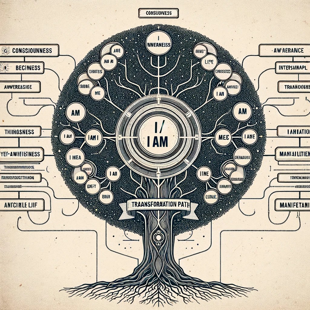 This structured mapping provides a clear visualization of how individual consciousness (“I”) and the essence of being (“I Am”) are connected to broader concepts such as consciousness, being, interconnectedness, transformation, and their manifestations in life. It serves as a conceptual map to understand the dynamic interplay between personal identity and universal existence.