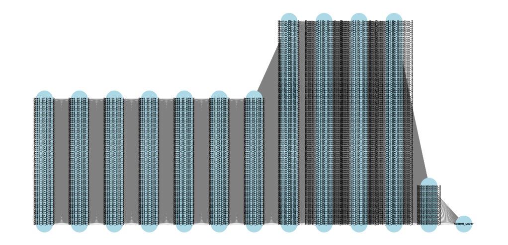 To visualize the network, the code generates a graph using NetworkX and Matplotlib, where each node represents a neuron, and edges represent connections between layers.
