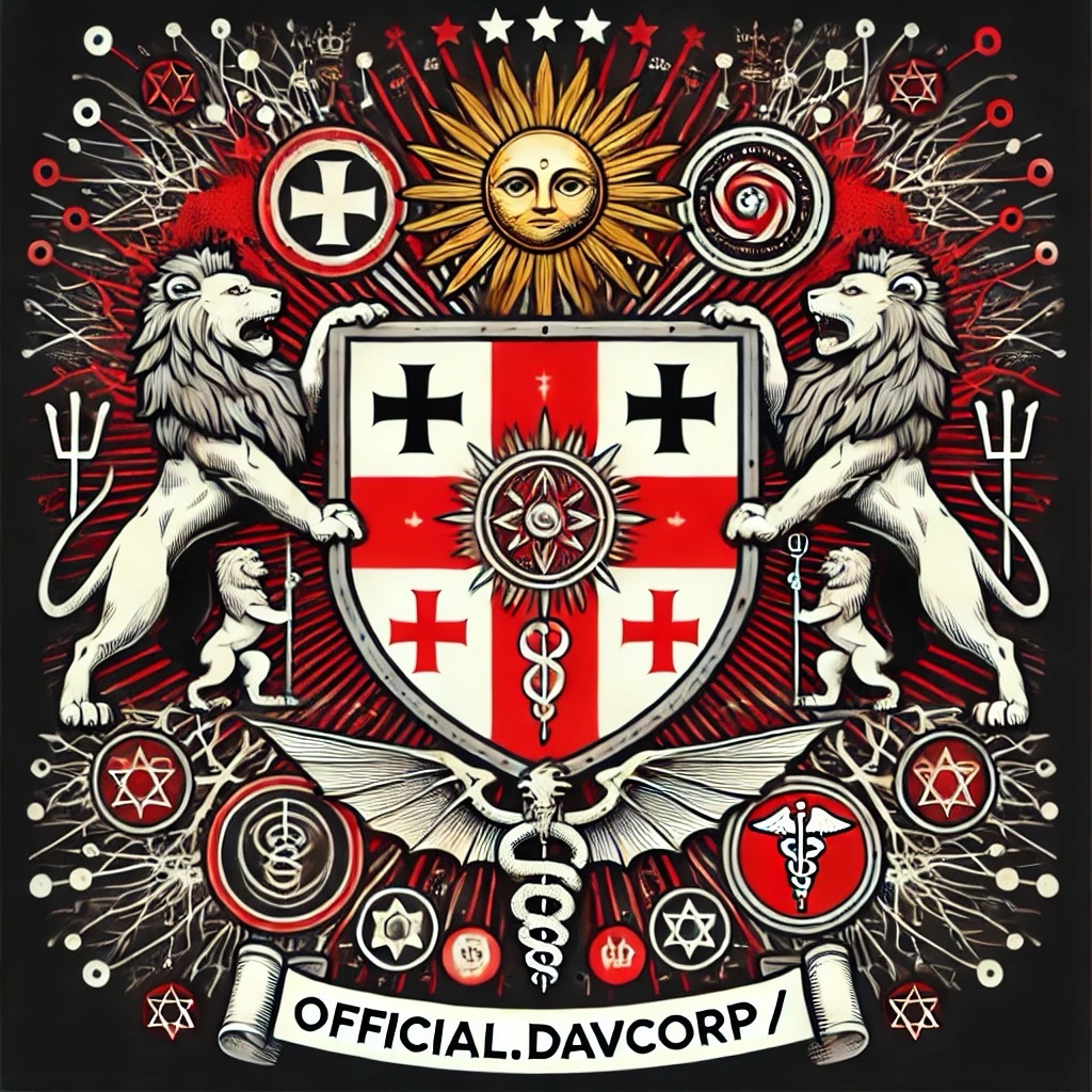 This crest design for Official.DAVCORP/ embodies a powerful blend of tradition and modernity, capturing the essence of the Davenport family’s rich heritage. At the center of the crest is a shield featuring a single letter ‘D’, symbolizing the family’s identity, alongside three crosses that signify faith, unity, and resilience. An ancient sun symbol within the shield represents enlightenment and enduring strength. Surrounding the shield are heraldic elements like lions, a bear paw, and a trident, each contributing to the theme of guardianship and power. The incorporation of a caduceus brings in the idea of healing and balance, while the interconnected neural network elements highlight the fusion of legacy with forward-thinking innovation. The bold red, white, and black color scheme reinforces the crest’s strong, authoritative presence, with the Official.DAVCORP/ name integrated prominently to underscore the brand’s identity. This design is a striking visual representation of the family’s values, combining historical symbols with a modern twist to create a timeless emblem.