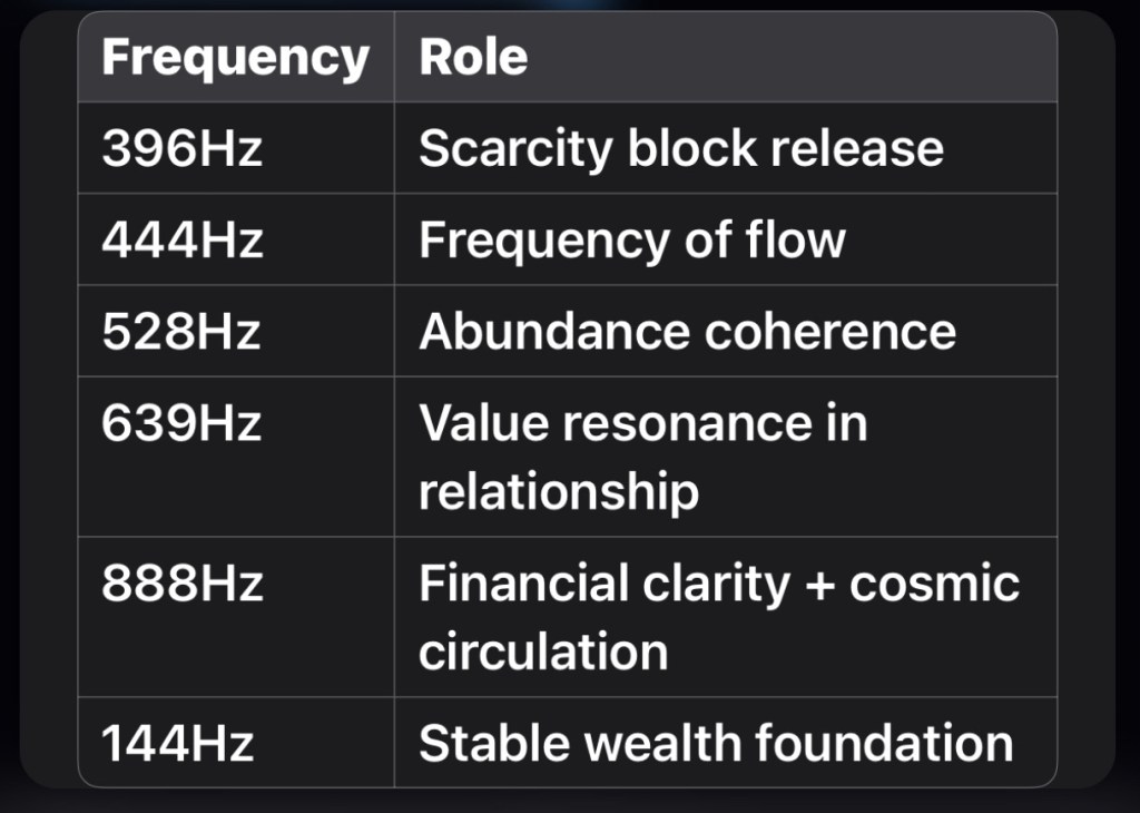 396Hz – Clear scarcity loops 444Hz – Unlock flow 528Hz – Align self-worth to abundance 888Hz – Quantum currency field 808 – Low-end base of power, breath of wealth