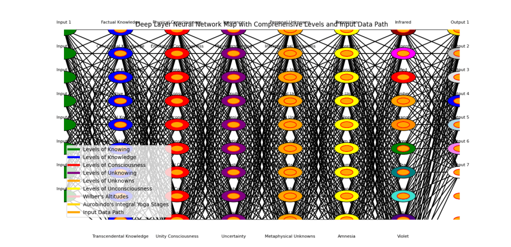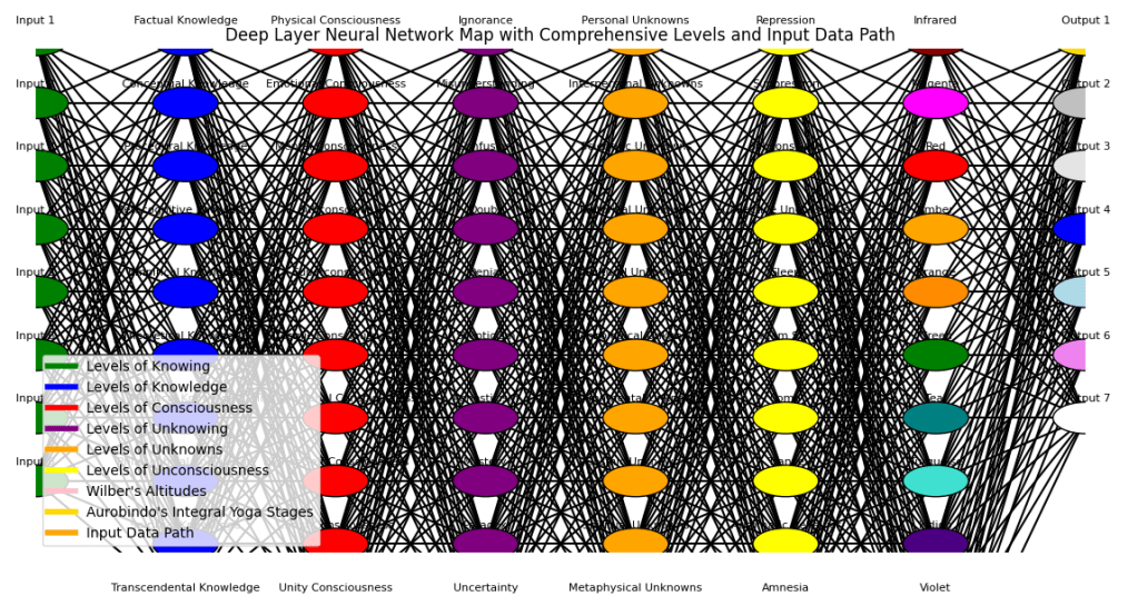 - The architecture includes layers representing different cognitive and consciousness states, such as Levels of Knowing, Levels of Knowledge, Levels of Consciousness, Levels of Unknowing, Levels of Unknowns, Levels of Unconsciousness, Wilber’s Altitudes, and Aurobindo’s Integral Yoga Stages.